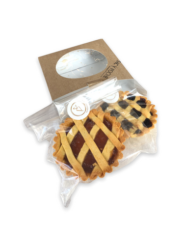 Per gli indecisi o per chi vuole assaggiare entrambi i gusti: due mini crostate di pasta frolla, una alla marmellata di mirtilli ed una all'albicocca.