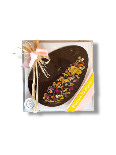 Cioccolato fondente: cioccolato fondente (pasta di cacao, zucchero, burro di cacao, Emulsionanti: Lecitina di soia. Estratto di vaniglia. Cacao min 61%), Fiori disidratati (viole del pensiero, fiori di sambuco, primule, rose, ibisco, fiordaliso, calendula, malva). Può contenere tracce di latte e frutta secca a guscio.