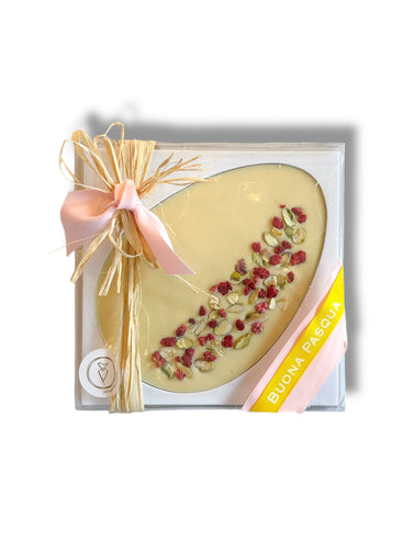 Cioccolato bianco con lamponi e pistacchi : cioccolato bianco (zucchero, burro di cacao, latte intero in polvere, emulsionante: Lecitina di soia, aroma naturale di vaniglia), lamponi disidratati, pistacchi. Può contenere tracce di latte e frutta secca a guscio.